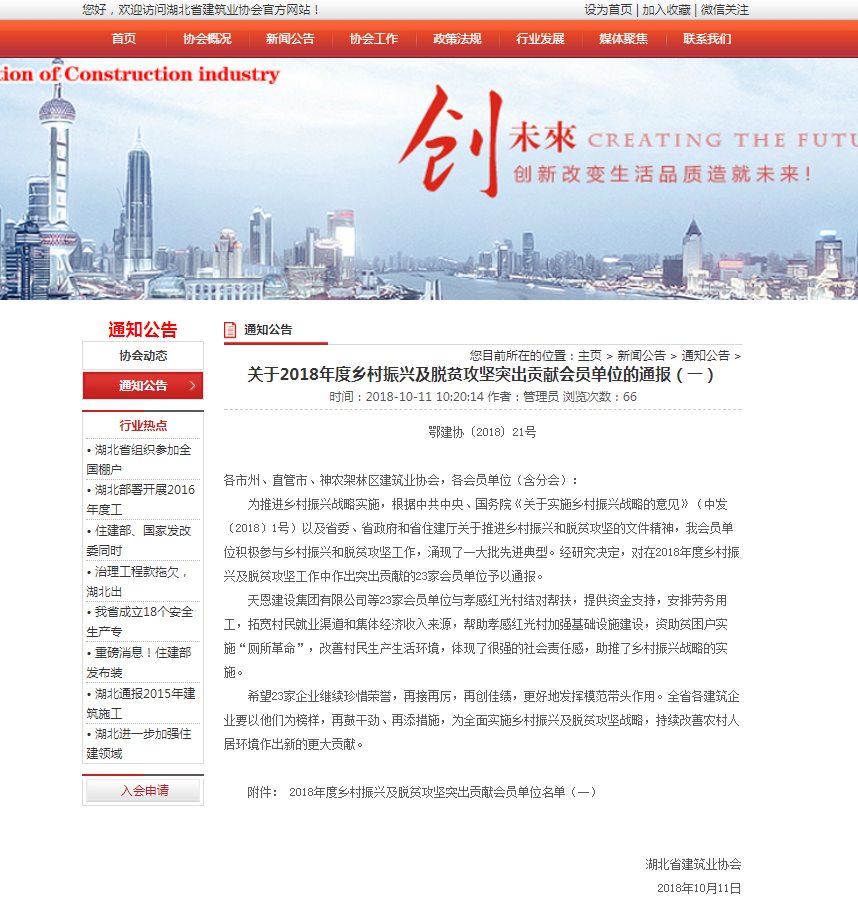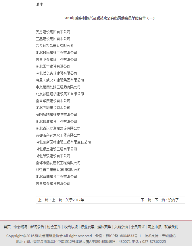 湖北省建筑業協會——關于2018年度鄉村振興及脫貧攻堅突出貢獻會員單位的通報