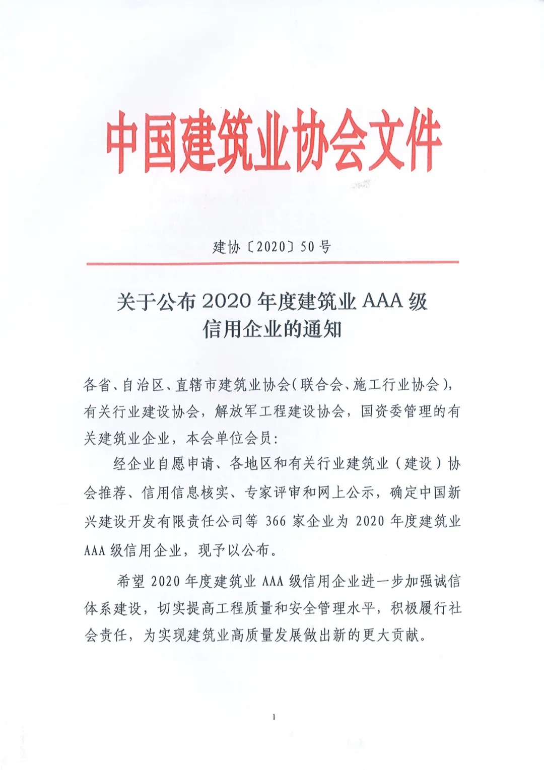 榮譽丨天恩集團榮獲2020年度中國建筑業協會AAA級信用企業
