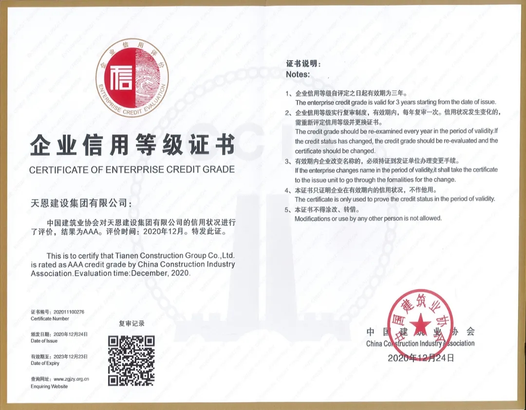 天恩建設集團有限公司秉承“誠信、務實、創新、領先”的經營理念,加強誠信體系建設,提高工程質量和安全管理水平,積極履行社會責任,為實現建筑業高質量發展做出了突出貢獻。2020年12月24日,中國建筑業協會授予我公司“2020年度建筑業AAA級信用企業”榮譽稱號。